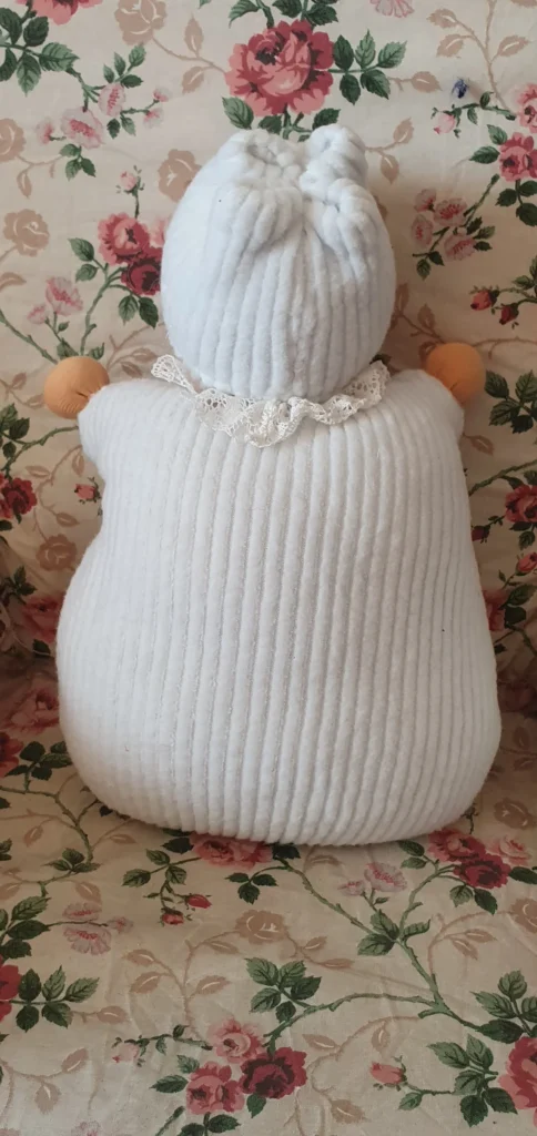 La bambola a cuscino è un gioco adatto ai bambini più piccoli che hanno appena iniziato a stare seduti. Ha un corpo morbido e imbottito di lana vergine, e una testa leggermente definita con gli occhi e la bocca appena accennati.